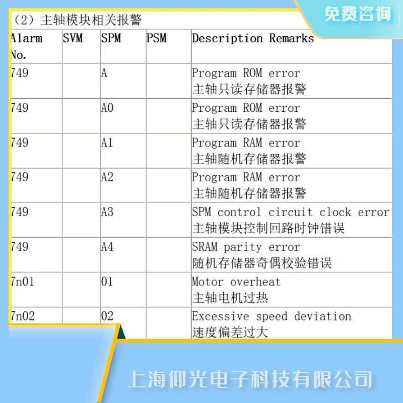 上海仰光發(fā)那科交流模擬主軸驅(qū)動單元常見故障:發(fā)那科數(shù)控系統(tǒng)維修,過熱報警維修,速度誤差過大報警維修,,直流側保險燒斷報警維修,缺相,控制電源保險燒斷維修,過速度報警維修,+24V高電壓,單元過載維修,+15V低電壓報警維修,直流側高電壓報警維修,直流側異常電流維修,CPU報警維修,ROM報警維修,控制板無顯示維修,主軸不轉維修,無任何報警顯示維修,發(fā)那科伺服驅(qū)動器維修,發(fā)那科伺服放大器維修,伺服報警維修代碼,放大器報警維修代碼,控制器維修代碼,發(fā)那科伺服控制器維修常見的故障有:上電無顯示維修、有顯示無輸出維修、過電流維修、過電壓維修、欠電壓維修、過熱維修、過載維修、過速維修、缺相維修、抖動維修、編碼器異常維修、模塊損壞維修、接地故障維修、編碼器報警維修、模塊損壞維修、參數(shù)錯誤維修,主板維修,電源板維修,控制板維修,電源輸入故障維修,驅(qū)動板維修,